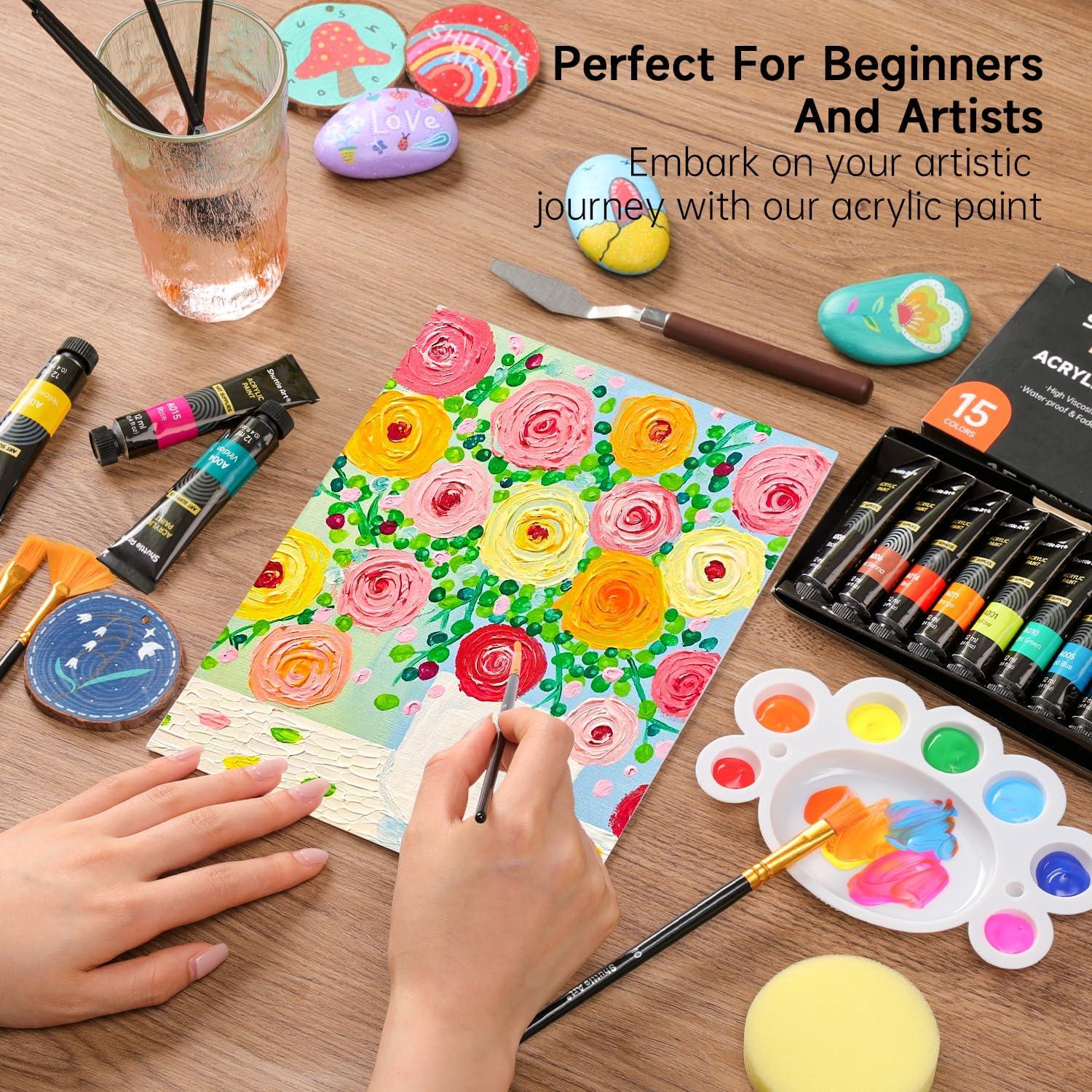 COMPLETE ACRYLIC PAINT SET : Shuttle Art 47 Pack Acrylic Paint Set includes 2 pack of 15 colors acrylic paint (12ml each tube) and 10 Paint Brushes 4 Painting Canvas 1 Paint Knife 1 Palette 1 Sponge. Perfect Gift for artist, adults and kids, painting and crafting