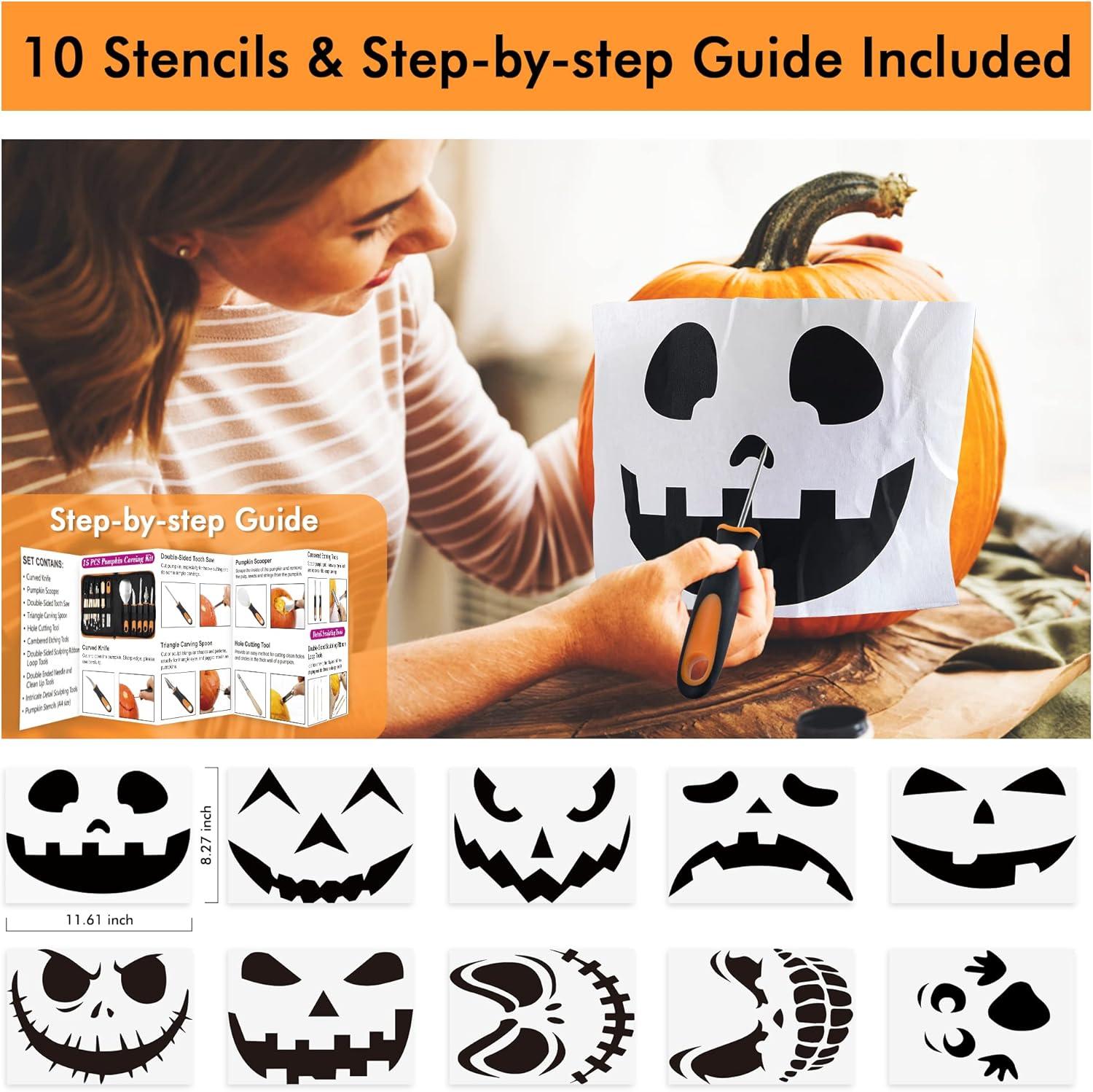 EASY TO USE WITH STENCILS & MANUAL: All tools are in good size for both kids and adults for carving. 10 different pumpkin stencils make the process of carving much easier and provide a variety of pattern options. Besides, our carving tool kit also comes with a detailed user manual, including step-by-step tutorials, making sure you can successfully make a jack-o-lantern