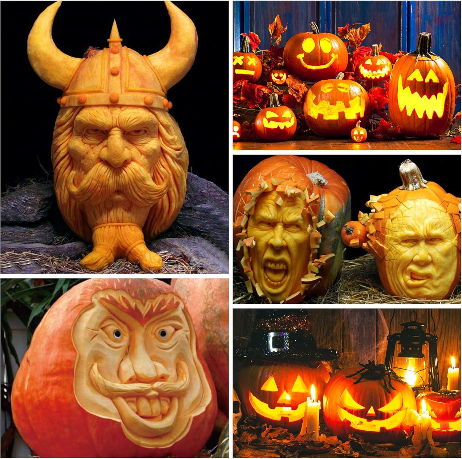 COMPLETE PUMPKIN CARVING KIT: Shuttle Art all-in one pumpkin carving kit contains 11 carving tools, 10 pumpkin stencils and 12 electronic candle, including 1 pumpkin scooper, 1 double-sided tooth saw, 1 small tooth saw, 1 pumpkin drill, 1 cambered etching tool, 6 double-sided precise sculpting tools and 1 storage bag. It also comes with a user manual that provides instructions and inspirations for beginners to start pumpkin carving. 12 electronic candles provide a safe way for you to light up your pumpkin lanterns