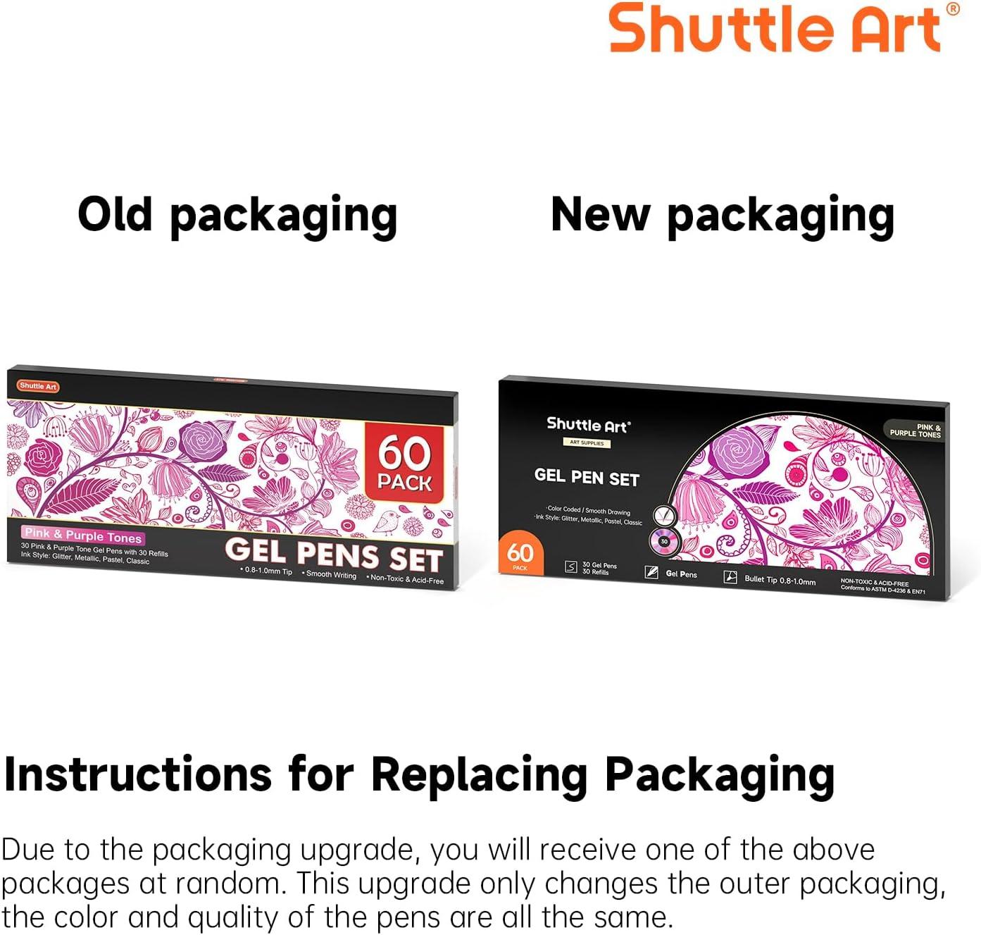 60 PACK PINK & PURPLE TONE GEL PENS: Shuttle Art gel pens set has 30 unique pink & purple tone colors with 30 matched refills, including 4 color types: glitter, metallic, pastel, classic. Specific color tone is suitable for nature, landscapes, animals and so on.