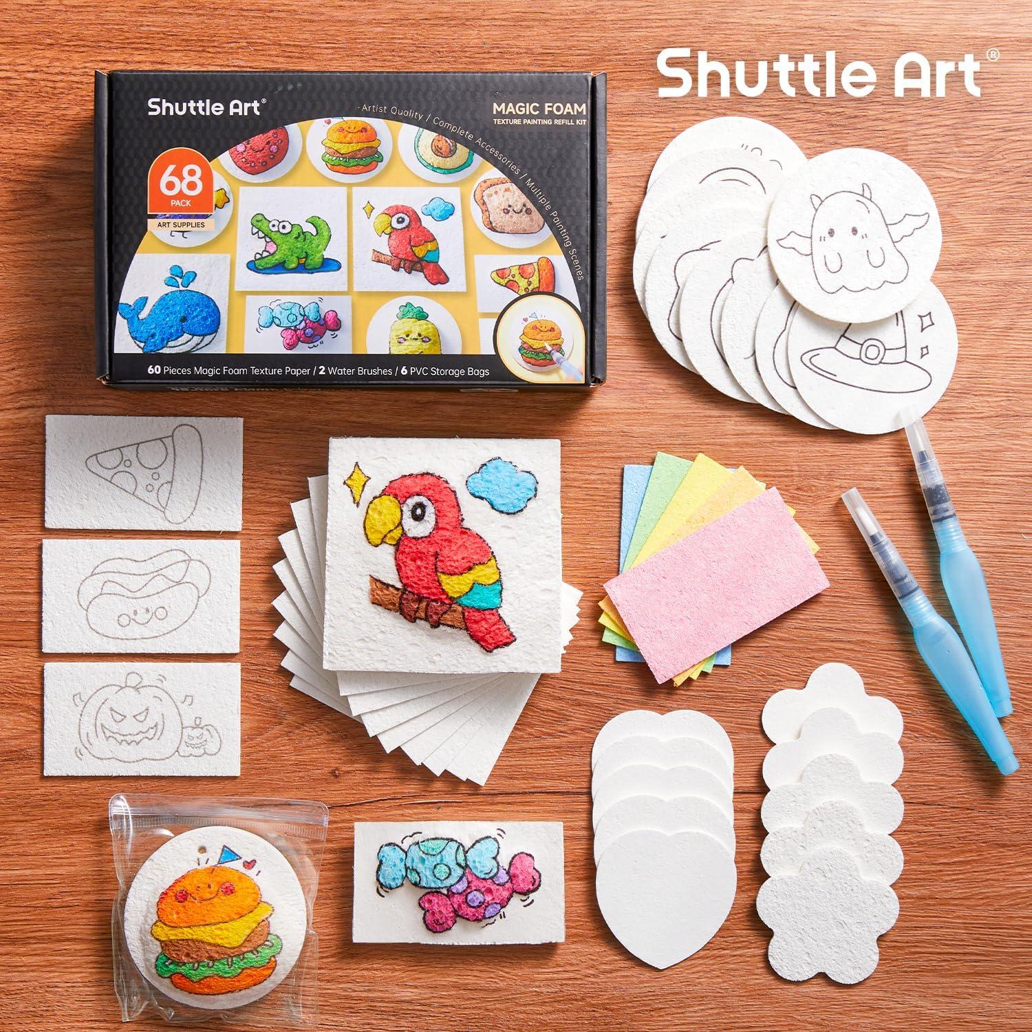 【68 Pcs Magic Foam Texture Painting Refill Kit】: Shuttle Art texture painting refill kit includes 60 sheets of foam texture paper, 2 water brushes(small and medium), and 6 PVC storage bags. Perfect for both children and adults, this refill pack includes everything you need for your artistic creation.