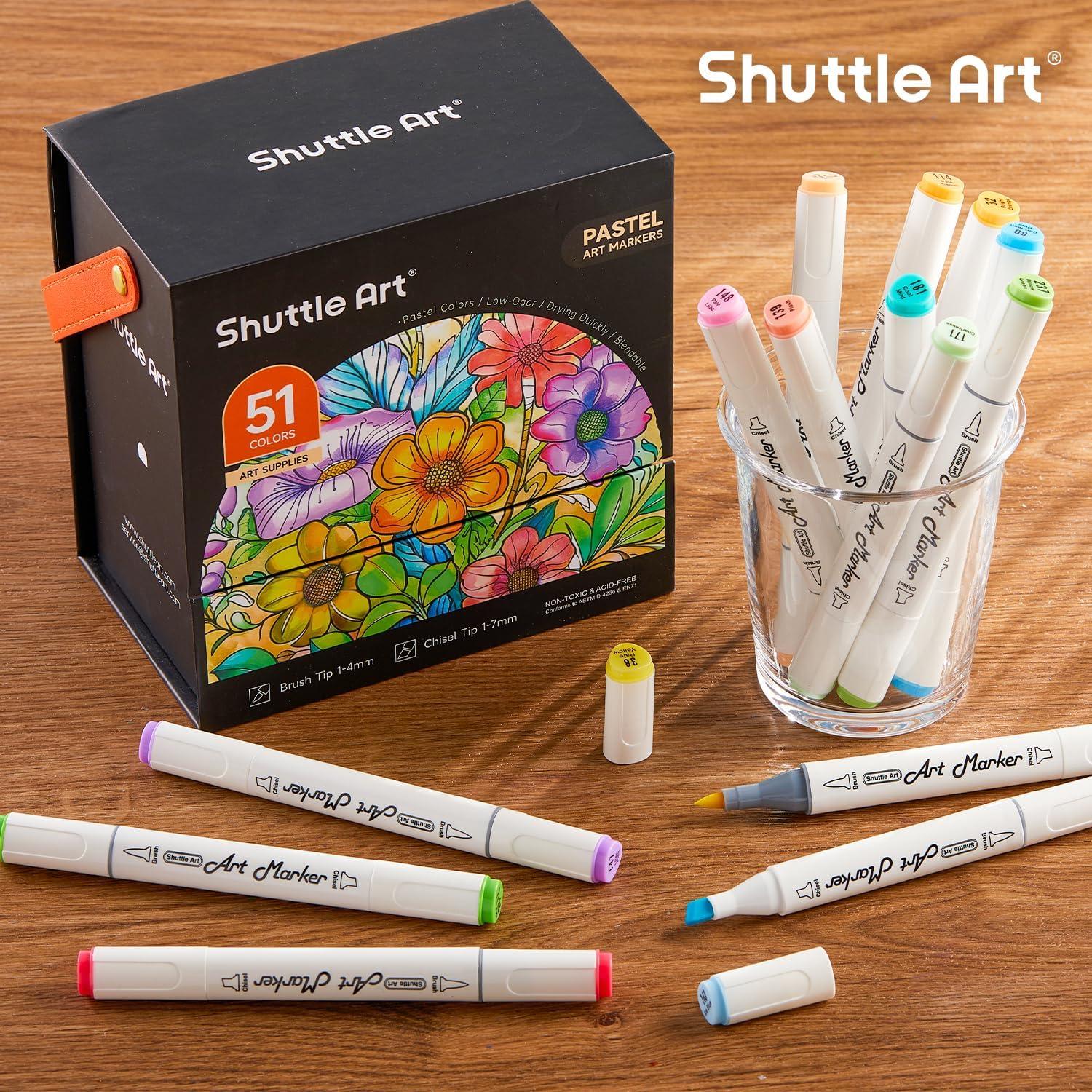 Shuttle Art Alcohol Markers Brush tip, Dual Tip Brush & Chisel Tip Art Marker Set, 50 Colors plus 1 Blender Permanent Marker Pens with Case Perfect for Illustration Students Adults Coloring(51 Pastel Colors Brush & Chisel Tip)