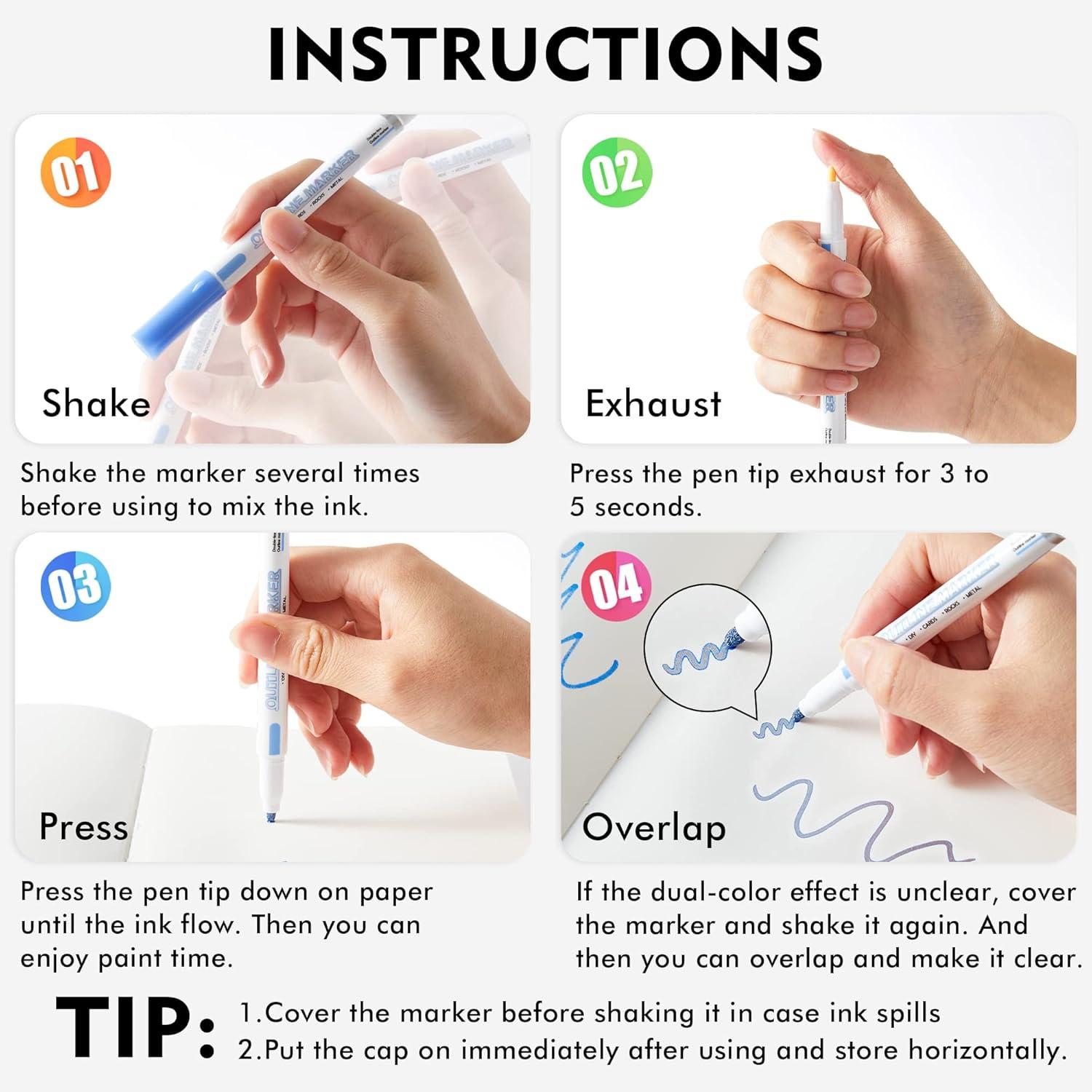 【Easy to Use】:With the cap on, shake the marker several times. And press the pen tip exhaust for 3 to 5 seconds. Then press the pen tip down on paper until the ink flow. Please put the cap on immediately after using and store horizontally.