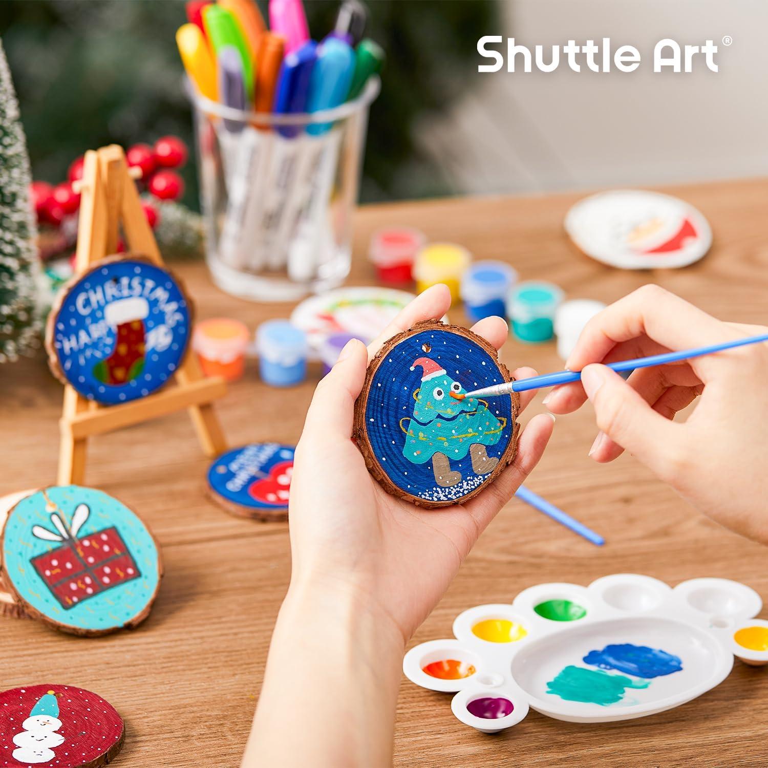 VALUE WOOD SLICES KIT: Shuttle Art wood slices kit contains almost everything you need to create wooden decorations for holidays, including 70 pcs pre-dirlled wood circles, 2 sets of 12 colors acrylic paint, 4 brushes,12 colors permanent markers, 5 transfer stickers with different themes, jute twine, red ribbon and more, complete wooden Christmas craft kit for kids and adults. CHOKING HAZARD-not for children under 3 yrs