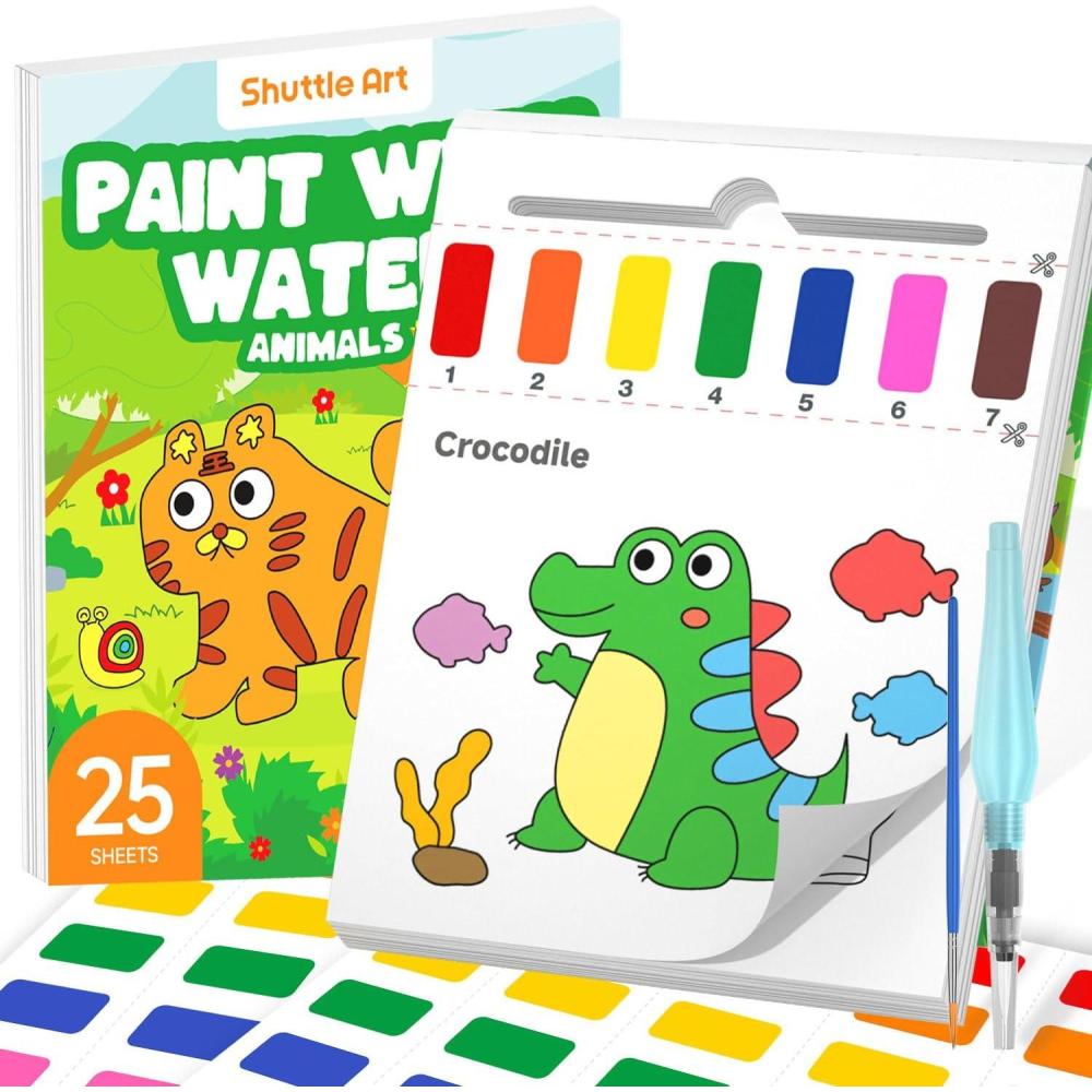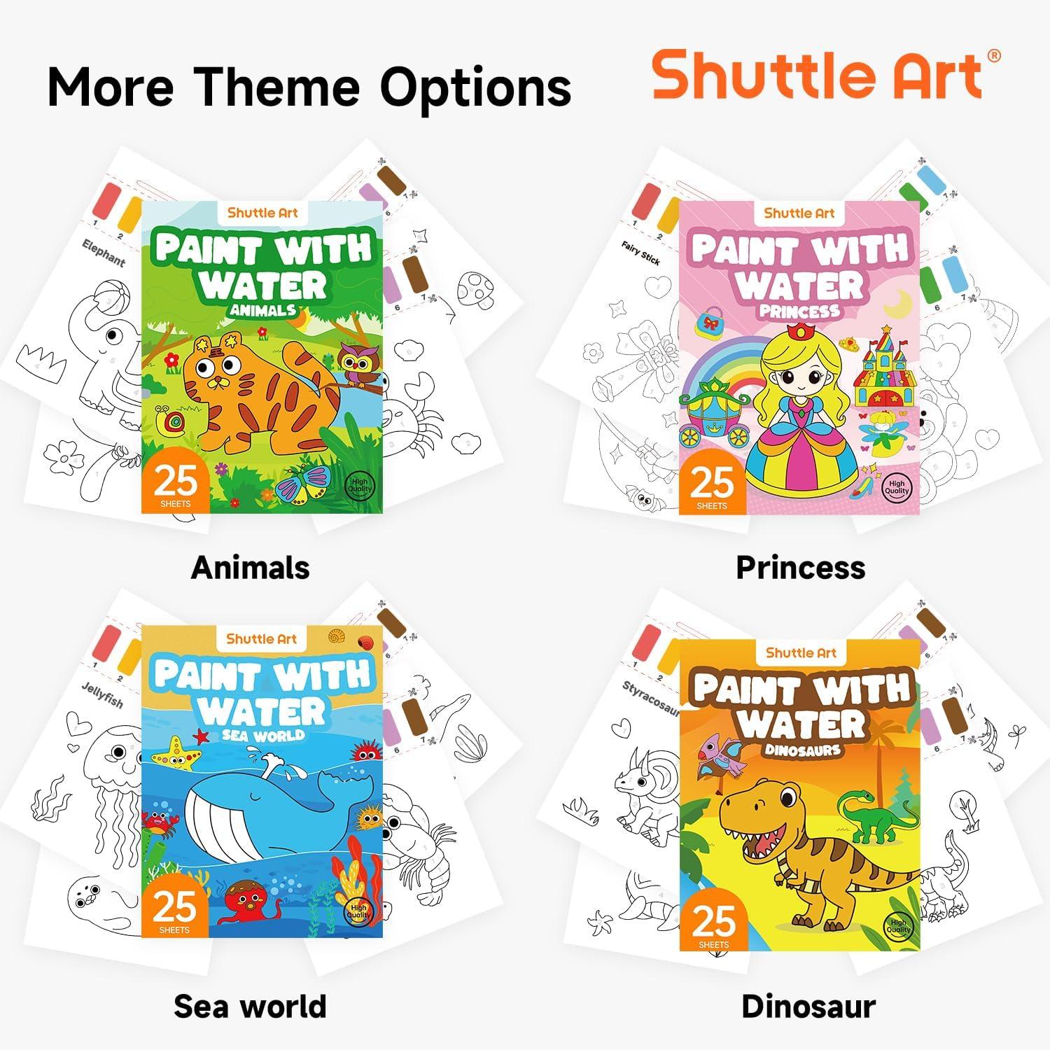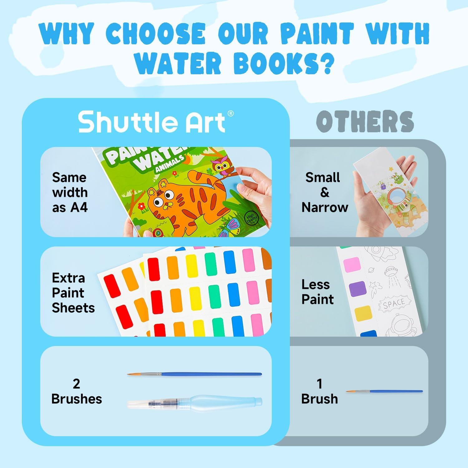 Shuttle Art Paint with Water Coloring Book for Kids, 25 Animals Themed Pages with 2 Brushes, Mess-Free Watercolor Paint Set, Travel-Friendly Art Craft Gift for Toddlers, Birthday Christmas Gift(Animals)