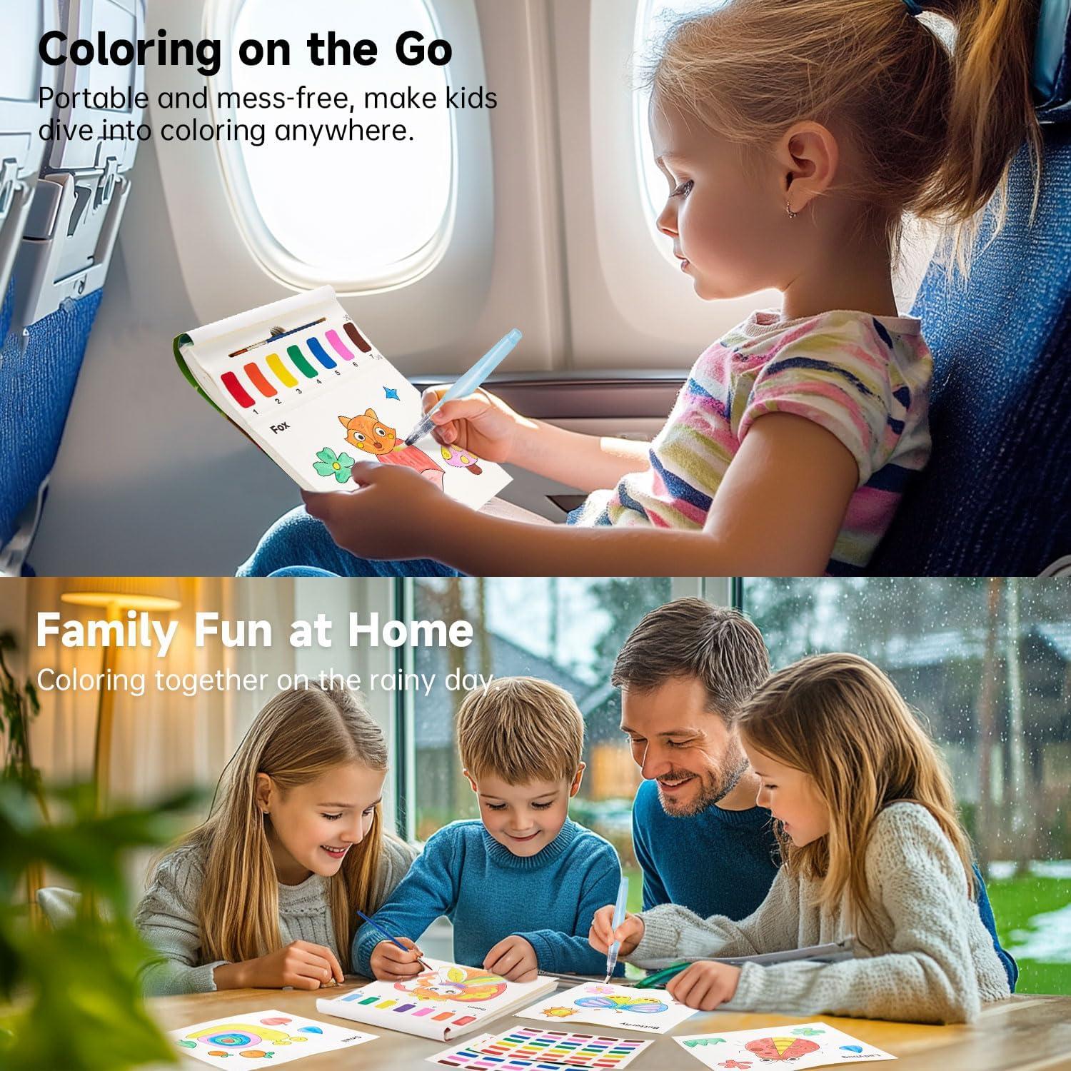 MESS-FREE & PORTABLE: This paint with water coloring book comes with everything you need for creative fun, including coloring sheets, watercolor paints, and brushes. With 5 additional pre-painted sheets, you won’t have to worry about running out of paint. It’s perfect for travel, car rides, or portable entertainment, providing a clean and mess-free drawing experience wherever you are
