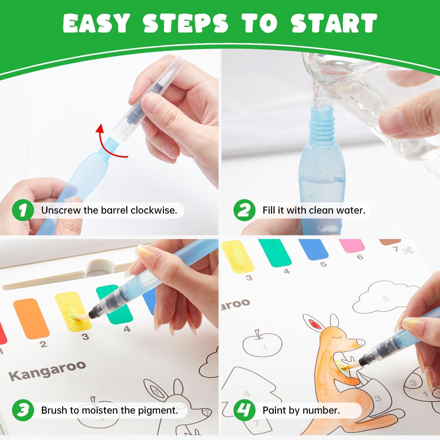 25 THEMED PAGES: This paint with water coloring book features 25 animals-themed patterns. It comes with 2 paint brushes and an extra 2 pre-painted sheets for endless fun. Each page is pre-printed with paint palettes, ready for little artists aged 1-8 to start their painting adventure anytime, anywhere