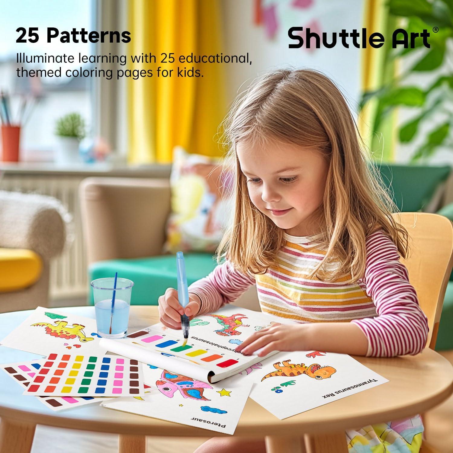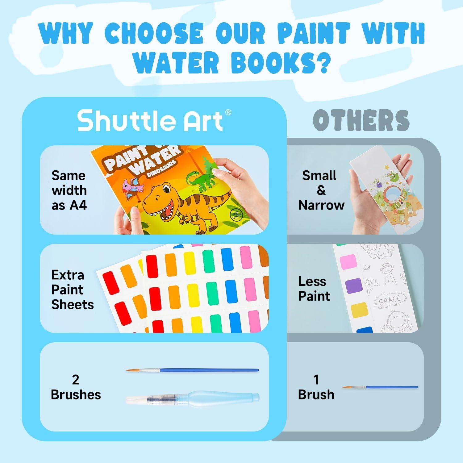 Shuttle Art Paint with Water Coloring Book for Kids, 25 Animals Themed Pages with 2 Brushes, Mess-Free Watercolor Paint Set, Travel-Friendly Art Craft Gift for Toddlers, Birthday Christmas Gift(Dinosaur)