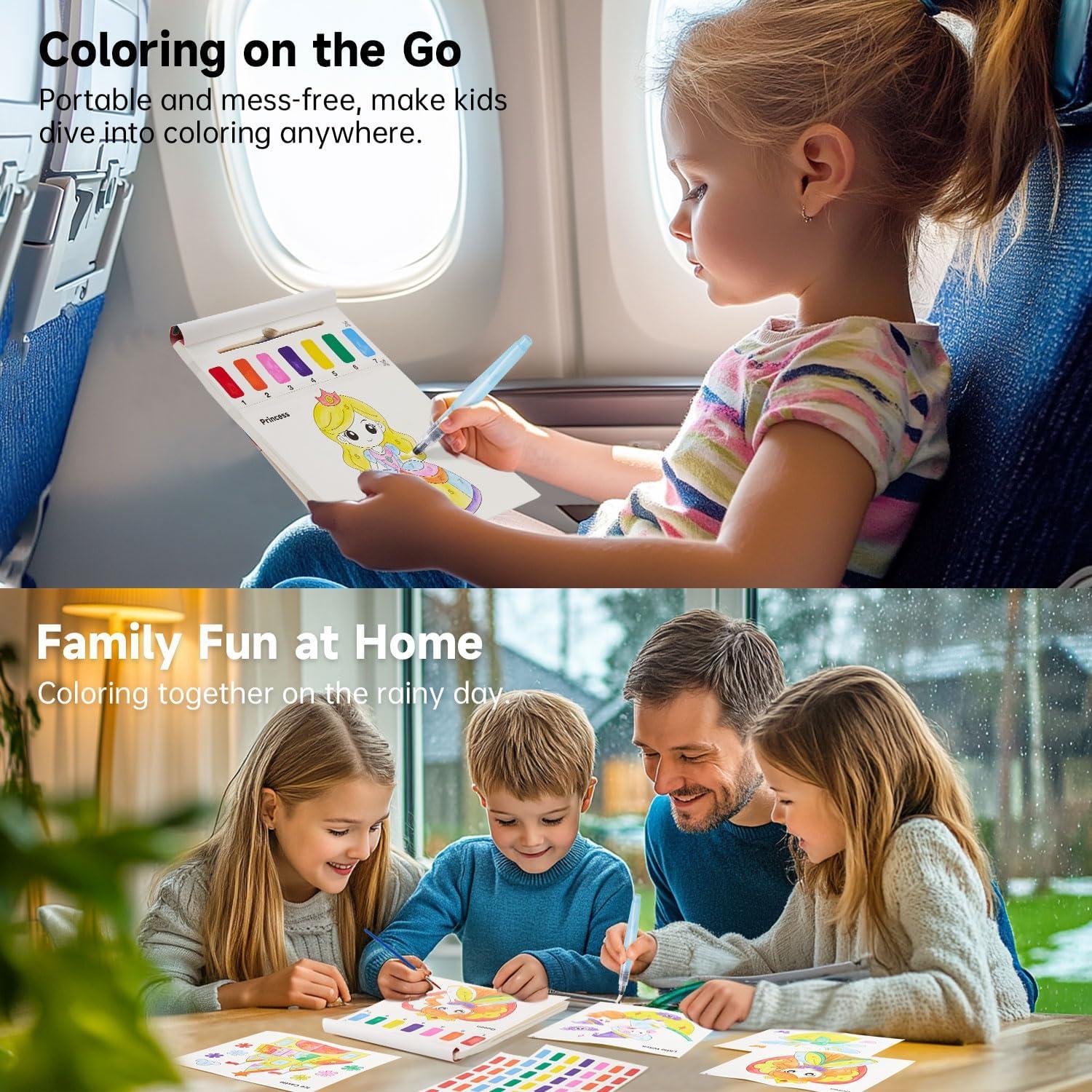 MESS-FREE & PORTABLE: This paint with water coloring book comes with everything you need for creative fun, including coloring sheets, watercolor paints, and brushes. With 5 additional pre-painted sheets, you won’t have to worry about running out of paint. It’s perfect for travel, car rides, or portable entertainment, providing a clean and mess-free drawing experience wherever you are
