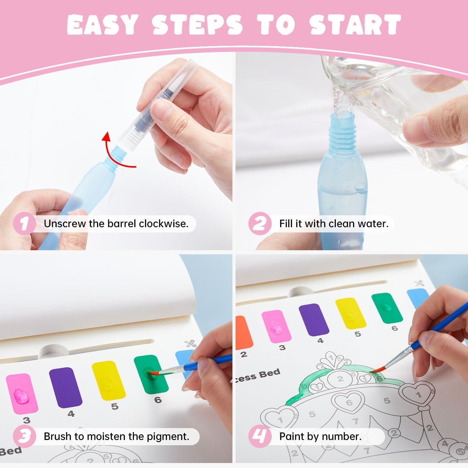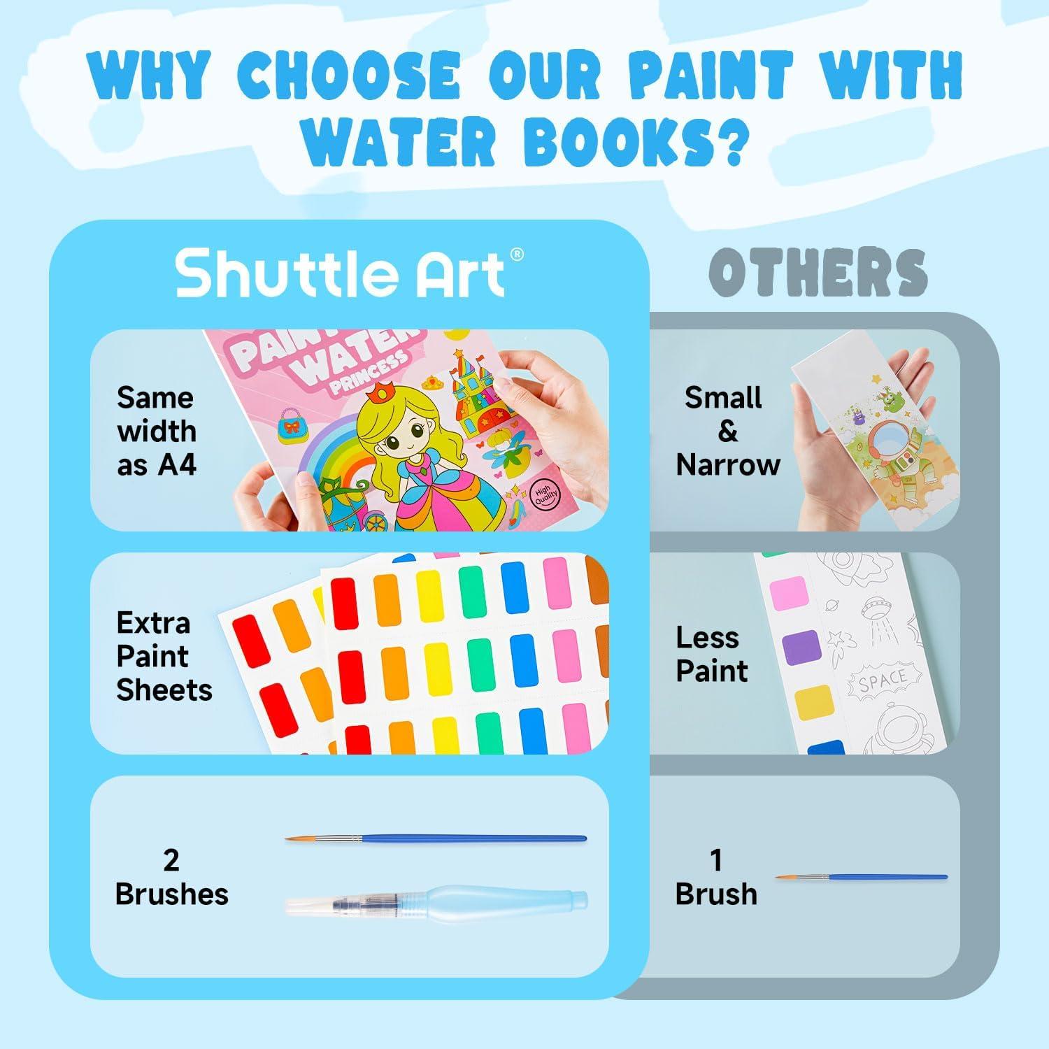 Shuttle Art Paint with Water Coloring Book for Kids, 25 Animals Themed Pages with 2 Brushes, Mess-Free Watercolor Paint Set, Travel-Friendly Art Craft Gift for Toddlers, Birthday Christmas Gift(Princess)