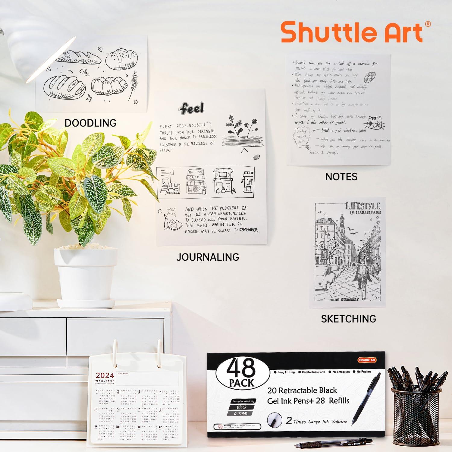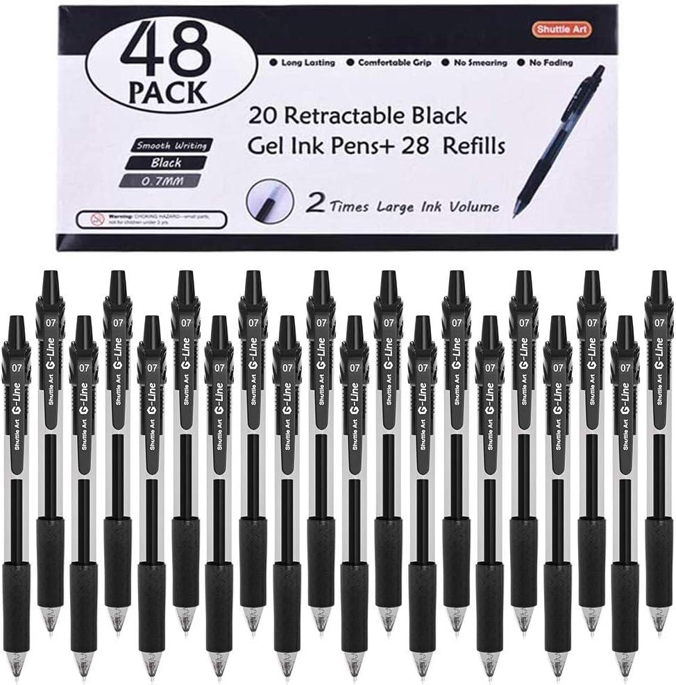 48 PACK BLACK GEL PENS: Shuttle Art 48 Pack retractable black gel Ink pens set has 20 pens with 28 refills, all with black ink. Ideal for your daily use like writing, marking, signing.