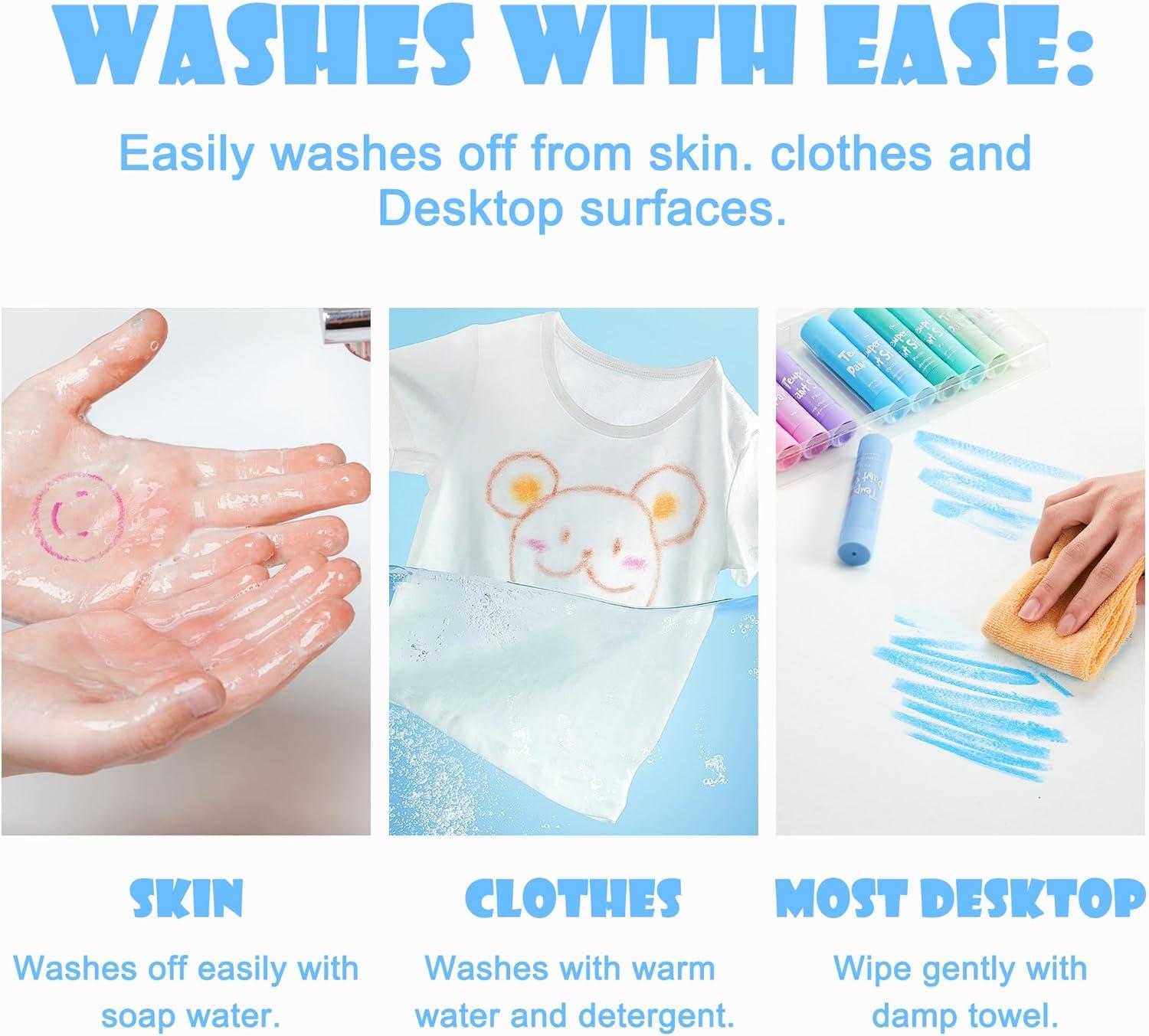 QUICK-DRYING & WASHABLE: Dries in 90 seconds. So there will be no smearing. MESS FREE! These paint sticks are WASHABLE and can be cleaned with soap water easily on non-porous surface. Parents no longer have to worry about painted shirt cuff issue or horrible table disasters.